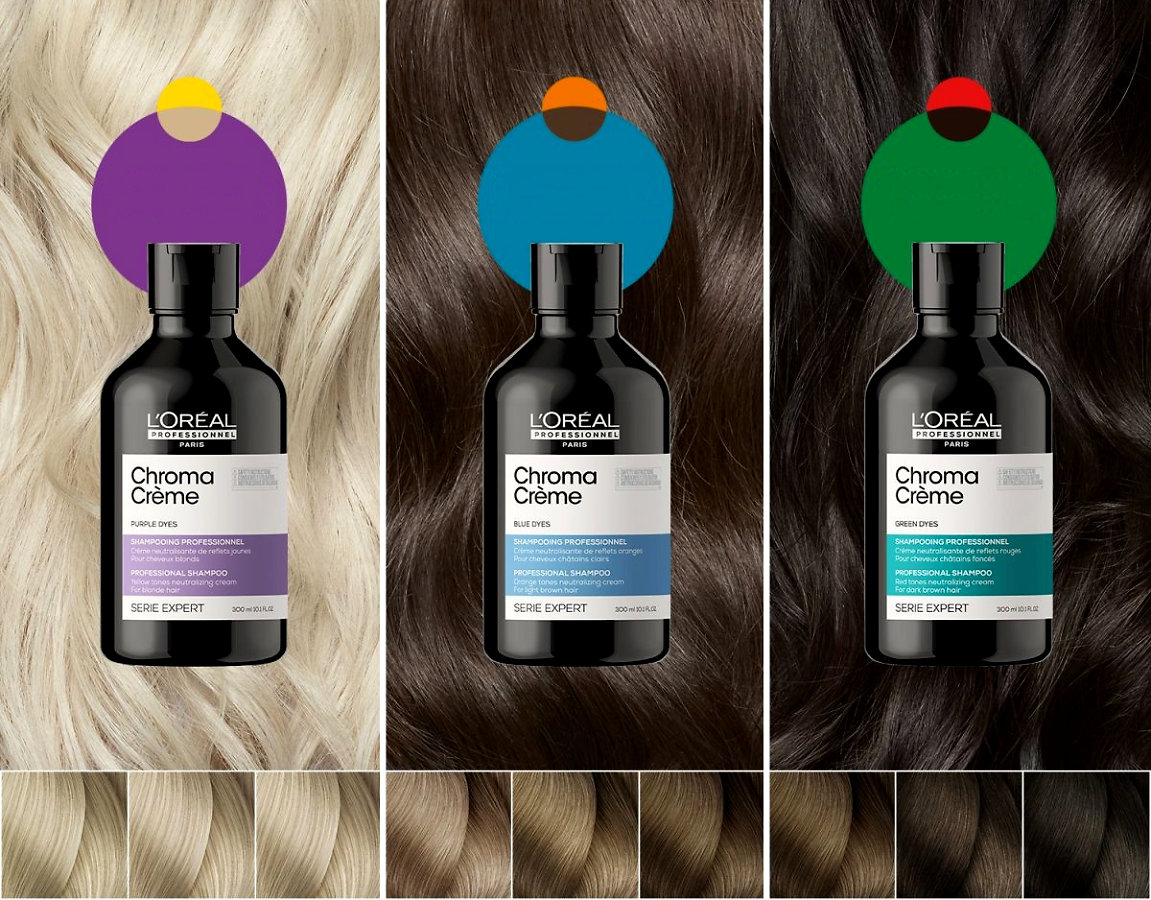 Werfen wir einen Blick darauf, welches Chroma Crème Shampoo für Ihre Haarfarbe am besten geeignet ist. Die Profilinie Chroma Crème bietet jetzt 3 verschiedene Shampoos an. Und das aus gutem Grund! Damit die Warmtonneutralisierung wirksam ist, müssen Sie das richtige Pigmentshampoo auswählen: Lila neutralisiert Gelbtöne, Blau neutralisiert Orangetöne und Grün neutralisiert Rottöne.