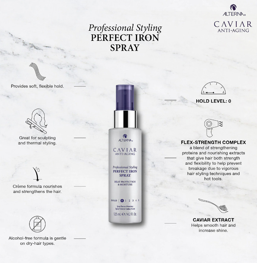 Sprühen Sie einzelne Teile des trockenen, sauberen Haares auf, bevor Sie glätten oder Lockenstab verwenden.