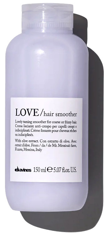 Davines Essential Haircare Love Hair Smoother ist eine beruhigende Leave-in Creme für krauses oder widerspenstiges Haar. Unsichtbare Leave-in Creme, die das Haar beruhigt. Hinterlässt keine Rückstände und macht das Haar geschmeidig und glänzend. Aktive Inhaltsstoffe des Davines Essential Haircare Love Hair Smoother Extrakte der Minuta Olive aus Sizilien (landwirtschaftlicher Betrieb von Hr. Carmelo Messina Ficarra, Messina):Reich an essentiellen Fettsäuren und Vitaminen die Elastizität und Geschmeidigkeit geben: Die Nebrodi Berge, das "grüne Herz" Siziliens, bilden die perfekte Lage für seltene alte sizilianische Olivensorten, wie die "Minuta". Im Vergleich zu anderen Olivenölen ist das feine, zarte Öl der Minuta Olive reich an fruchtigen und floralen Aromen. Es ist sehr nährend durch den hohen Gehalt an Polyphenolen und Vitamin E. Die Jahrhunderte alten Olivenhaine, die immer noch Oliven produzieren, sind ein Zeichen für die historisch wichtige Funktion der Minuta Olive Rhiziobian Gum: Natürliches Polymer,welches das Haar mit Feuchtigkeit versorgt, Volumen spendet und das Haar kompakter erscheinen lässt MICA: Mineralischer Puder der das Licht reflektiert und so das Haar glänzen lässt Duft: Der verwendete Duft in LOVE erinnert an Zitronen Anwendung des Davines Essential Haircare Love Hair Smoother Eine geeignete Menge, nach der Anwendung von LOVE/ Shampoo ins handtuchtrockene Haar geben und nicht ausspülen. Es empfiehlt sich ein Glätteisen beim Styling zu verwenden. Ideal um krauses Haar zu beruhigen und zu glätten. Ergebnis des Davines Essential Haircare Love Hair Smoother Das Haar ist mit Feuchtigkeit versorgt, wirkt beruhigt und glatt.
