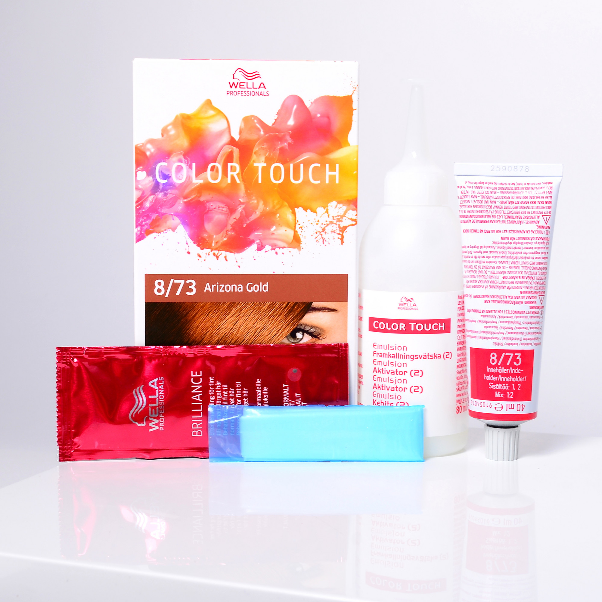 Ziehen Sie Ihre Handschuhe an. Mischen Sie die Farbe mit dem Entwickler in der Anwendungsflasche. Dann sofort auf das Haar auftragen. 20 Minuten einwirken lassen (ohne Wärmezufuhr). Dann gut ausspülen. Shampoo und Brilliance Mask auftragen.