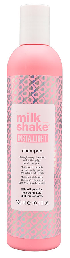 Milk_Shake Insta.Light Shampoo ist ein stärkendes Shampoo mit aufpolsterndem Effekt, ideal für alle Haartypen. Diese innovative Formel sorgt für sanfte Reinigung, sofortige Geschmeidigkeit und strahlenden Glanz, während das Haar leichter kämmbar wird. Angereichert mit Milchproteinen, Hyaluronsäure und Fruchtextrakten regeneriert, hydratisiert und schützt es das Haar. Es ist der erste Schritt in der Milk_Shake Insta.Light Pflege, um maximale Ergebnisse zu erzielen.