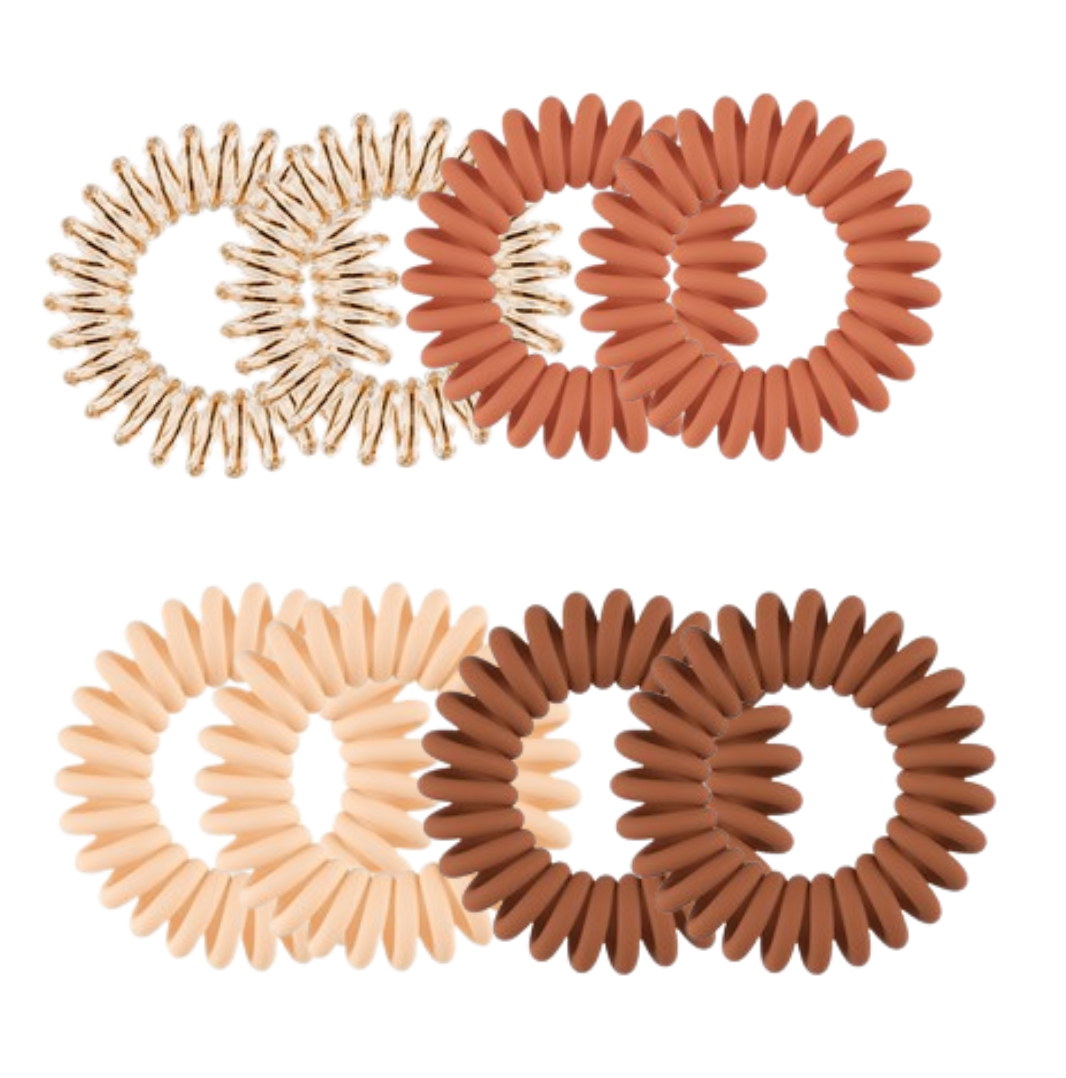 Dank ihrer innovativen spiralförmigen Gestaltung ziehen diese Haargummis nicht an den Haaren, brechen sie nicht und hinterlassen keine Abdrücke. Sie sind aus hygienischem und wasserfestem Material gefertigt, und ihre glatte Oberfläche verfängt sich nicht in den Haaren.
