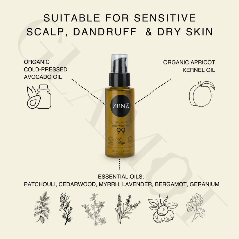 Das multifunktionale ZENZ Organic Oil Treatment Deep Wood Nr. 99 bietet intensive Pflege, Kraft und Regeneration für alle Haartypen – besonders für eine empfindliche oder trockene Kopfhaut mit Neigung zu Juckreiz oder Schuppenbildung. Es stärkt die Haarfollikel, reduziert Reizungen und hinterlässt das Haar geschmeidig, elastisch und glänzend.